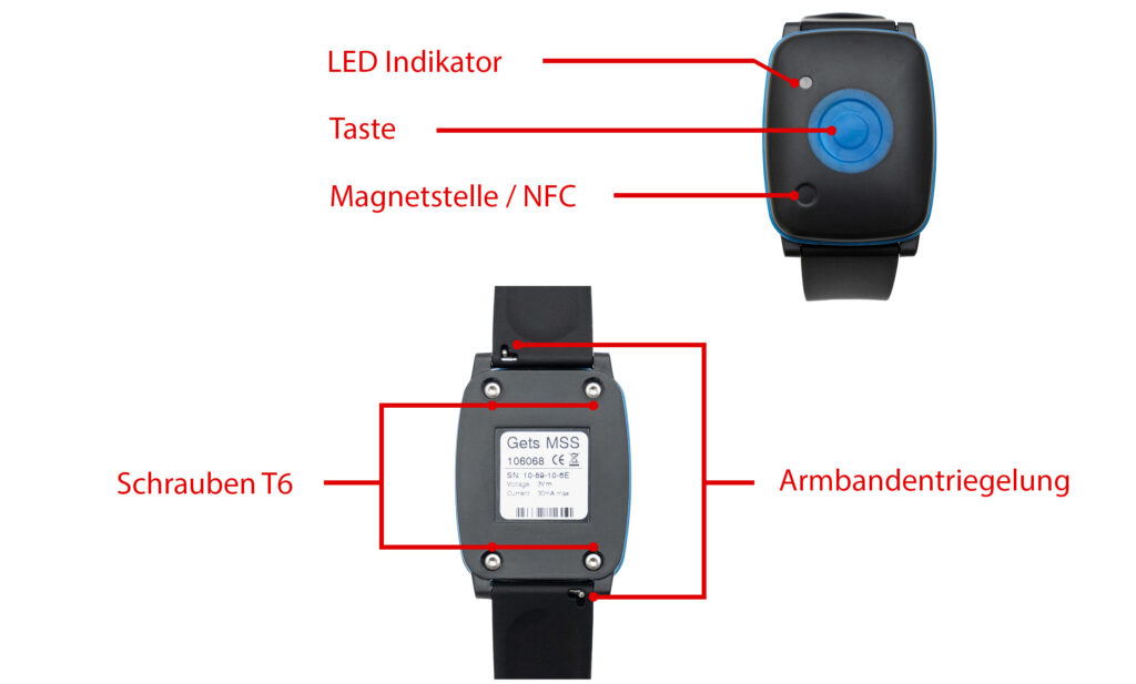 Um den Sender auszuschalten, drücken und halten Sie die Taste gedrückt. Die LED beginnt rot zu blinken. Nach einiger Zeit leuchtet die LED konstant rot auf. Halten Sie jetzt den Magneten an die Magnetzone, während Sie die Taste immer noch gedrückt halten. Die LED leuchtet zuerst violett und anschliessend blau auf. Jetzt können Sie den Magneten entfernen, sowie die Taste wieder loslassen.